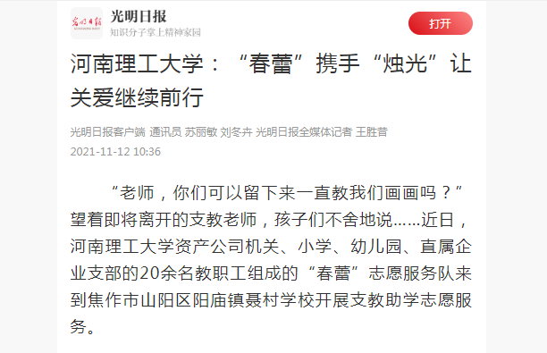 本网讯(记者 苏丽敏)光明日报客户端2021年11月12日以《河南理工大学:“春蕾”携手“烛光”让关爱继续前行》为题并配发图片;报道河南理工大学“春蕾”志愿服务队来到焦作市山阳区阳庙镇聂村学校开展支教助学志愿服务。河南日报客户端、大河报客户端等媒体也对此作了报道,相关内容如下: