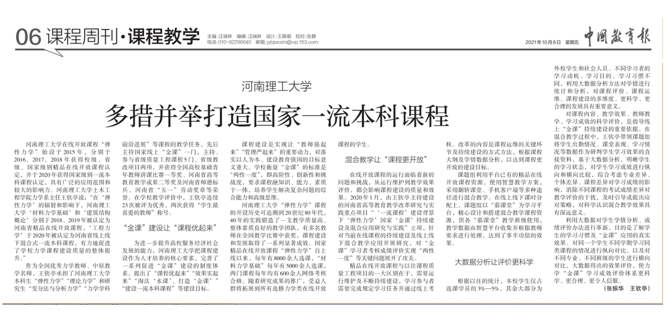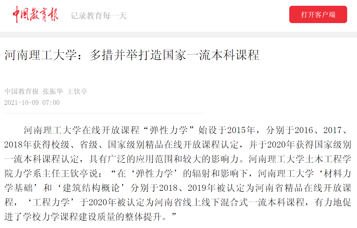 河南理工大学在线开放课程“弹性力学”始设于2015年,分别于2016、2017、2018年获得校级、省级、国家级别精品在线开放课程认定,并于2020年获得国家级别一流本科课程认定,具有广泛的应用范围和较大的影响力。河南理工大学土木工程学院力学系主任王钦亭说:“在‘弹性力学’的辐射和影响下,河南理工大学‘材料力学基础’和‘建筑结构概论’分别于2018、2019年被认定为河南省精品在线开放课程,‘工程力学’于2020年被认定为河南省线上线下混合式一流本科课程,有力地促进了学校力学课程建设质量的整体提升。”