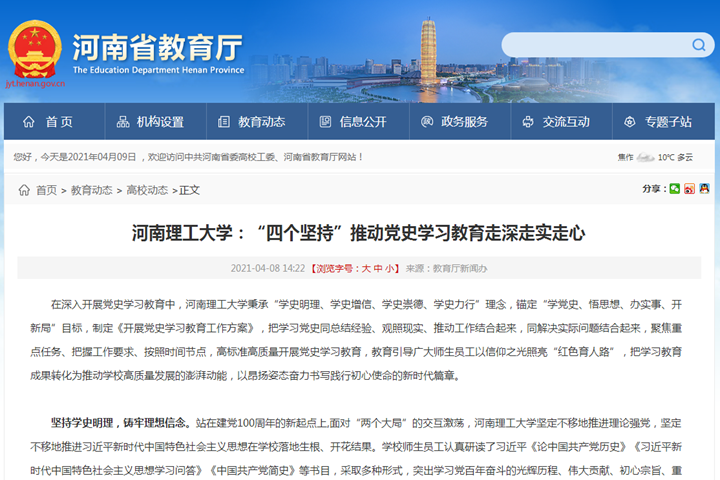 在深入开展党史学习教育中,河南理工大学秉承“学史明理、学史增信、学史崇德、学史力行”理念,锚定“学党史、悟思想、办实事、开新局”目标,制定《开展党史学习教育工作方案》,把学习党史同总结经验、观照现实、推动工作结合起来,同解决实际问题结合起来,聚焦重点任务、把握工作要求、按照时间节点,高标准高质量开展党史学习教育,教育引导广大师生员工以信仰之光照亮“红色育人路”,把学习教育成果转化为推动学校高质量发展的澎湃动能,以昂扬姿态奋力书写践行初心使命的新时代篇章。