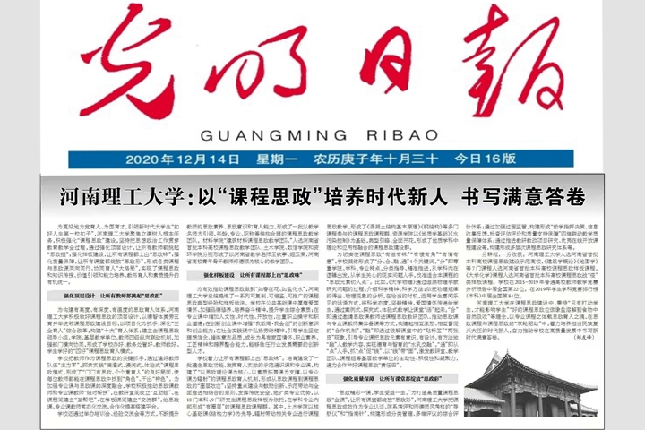 本网讯(记者 徐春浩)《光明日报》2020年12月14日第10版以《河南理工大学:以“课程思政”培养时代新人 书写满意答卷》为题并配发图片,报道校党委书记邹友峰署名文章,文中深刻阐述了学校为更好地为党育人、为国育才,引领新时代大学生“扣好人生第一粒扣子”,聚焦立德树人根本任务,积极强化“课程思政”建设,坚持把思想政治工作贯穿教育教学全过程,实现了课程思政和知识传授、价值引领和能力培养、教书育人和素质提升有机统一的育人理念。光明网等予以转载。相关内容如下: