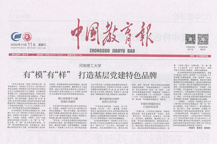 本网讯(记者 徐春浩 通讯员 康俊亚 蔺海晓)《中国教育报》2020年11月11第6版以《河南理工大学:有“模”有“样” 打造基层党建特色品牌》为题,报道全国首批“党建工作样板支部”培育创建单位、学校土木工程学院力学系党支部深入贯彻落实习近平新时代中国特色社会主义思想和党的十九大精神,扎实推进培育创建工作,以政治建设为统领,以提升组织力为重点,以推动事业发展为落脚点,严格对标看齐,勇于改革创新,建设有“模”有“样”党支部,充分发挥支部战斗堡垒作用和党员先锋模范作用,为推进该系高质量内涵式发展提供了坚强的组织保障。中国教育新闻网等予以转载。相关内容如下: