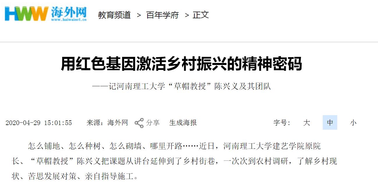 人民日报海外网2020年4月29日以《用红色基因激活乡村振兴的精神密码——记河南理工大学“草帽教授”陈兴义及其团队》为题并配发图片,报道学校建艺学院原院长、“草帽教授”陈兴义及其团队把课题从讲台延伸到了乡村街巷,用一把“红色钥匙”激活了乡村振兴的精神密码。大河网、中华网、中华高校网、猛犸新闻网、大象新闻网、河南日报客户端、大河报客户端、大河报网、新豫网、中原经济网、河南经济报网、河南经济论坛、河南教育宣传网、河南高校资讯网、河南高校行等媒体也对此作了报道。相关内容如下:
