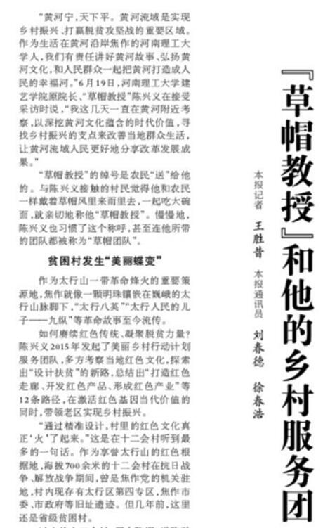 “改变乡村落后面貌,必须有一支有乡村情怀、专业水平的团队。”“草帽教授”团队成员、河南理工大学建艺学院院长王同文说,“多年来,陈兴义正是以自己的行动带出了一支不被利益左右、乐于公益,不被定式约束、敢于创新,不被专业限制、学科齐全的乡建‘铁军’”。