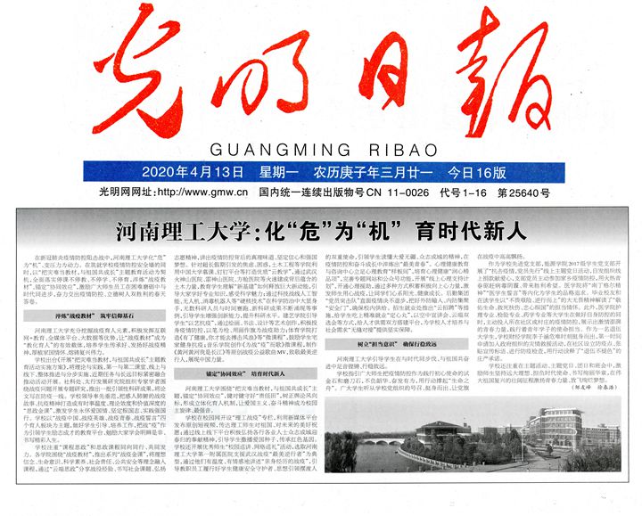 2020年4月13日,《光明日报》在第10版以《河南理工大学:化“危”为“机” 育时代新人》为题并配发图片,报道我校在新冠肺炎疫情防控阻击战中,化“危”为“机”、变压力为动力,在筑就学校疫情防控安全墙的同时,以省委高校工委、省教育厅在全省教育系统开展的“把灾难当教材,与祖国共成长”主题教育活动为契机,全面落实停课不停教、不停学、不停育,淬炼“战疫教材”、锚定“协同效应”,奋力交出疫情防控、立德树人双胜利的春天答卷。光明网等予以转载。相关内容如下: