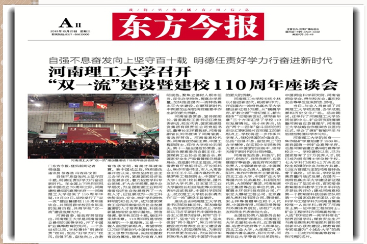《中国煤炭报》2019年10月24日第1版以《河南理工大学举行“双一流”建设暨建校110周年座谈会》为题,《中国科学报》2019年10月23日第2版以《河南理工大学迎建校110周年》为题,《中国产经新闻报》2019年10月24日第7版以《河南理工大学“双一流”建设暨建校110周年座谈会召开》为题,《东方今报》2019年10月23日第AⅡ版头条以《河南理工大学召开“双一流”建设暨建校110周年座谈会》为题并配发图片,光明网2019年10月23日以《河南理工大学:百年再出发,迈向“双一流”》为题,河南日报客户端2019年10月20日以《这所河南建立最早的高等学校迎来110岁“生日”,他们这样纪念》为题并配发图片,报道我校举行“双一流”建设暨建校110周年座谈会,回顾学校百十年发展历程,共商学校“双一流”建设发展大计。中国科学网、中国产经新闻网等予以转载。相关内容如下: