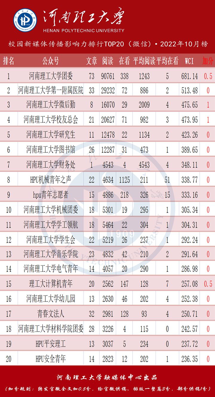 本月,校内微信公众号平台活跃度较上月相比略有上升。其中河南理工大学团委WCI681.14(微信传播指数)位居榜单第一,其中“青年大学习特辑 | 中国共产党第二十次全国代表大会在京开幕”一文获得3.8万浏览量。河南理工大学第一附属医院凭借33篇优质推文,以WCI513.48位居榜单第二。