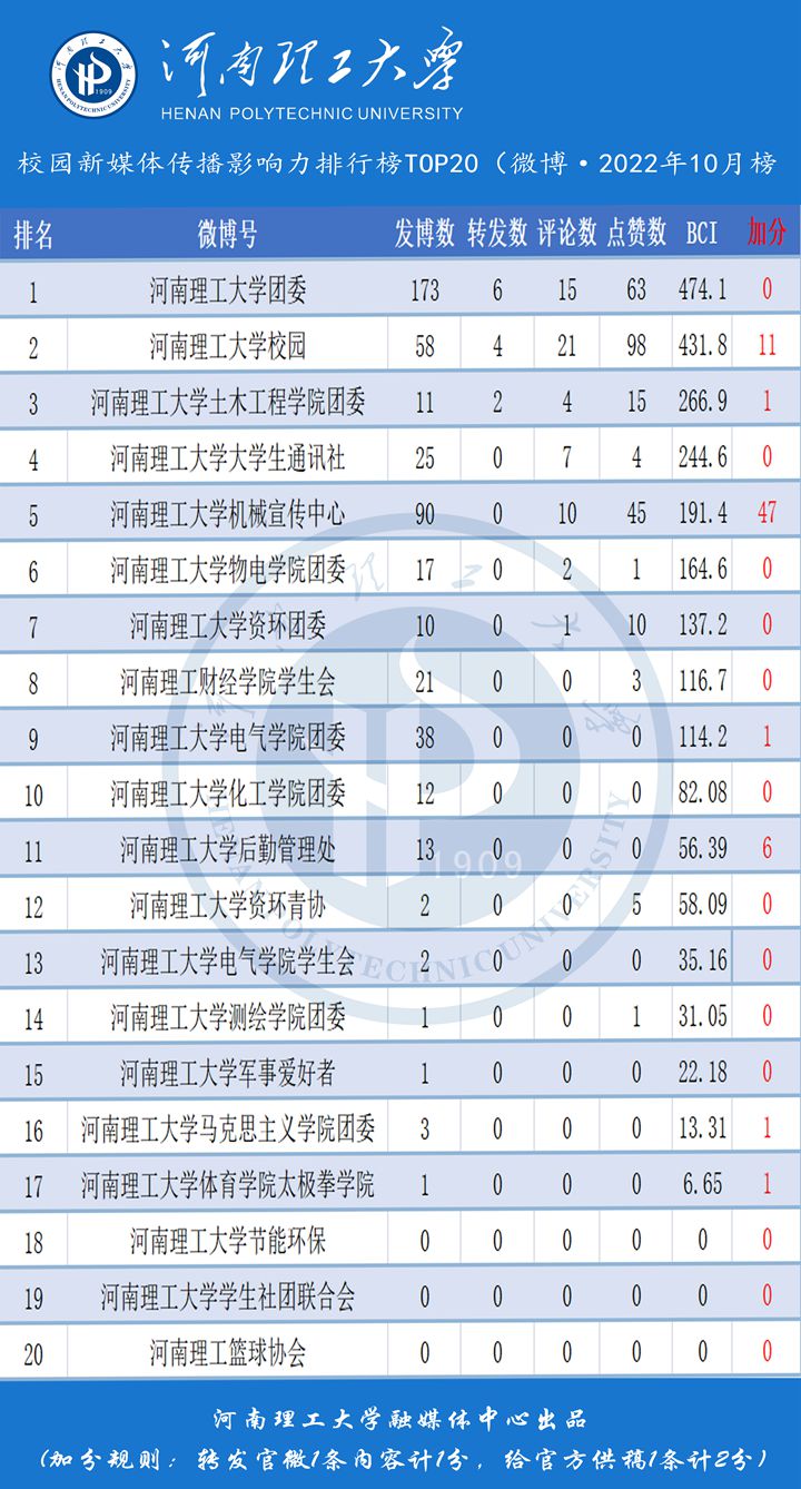 本月,校内二级单位微博平台活跃度比上月有明显提升,@河南理工大学团委BCI474.1(微博传播指数),位居榜单第一。#围绕历史上的今天#,#晚安理工#等话题深受粉喜欢。@河南理工大学校园,积极与粉丝互动,分享学校风景、优美句子,位居榜单第二。