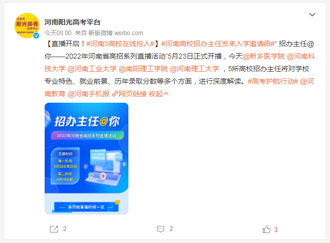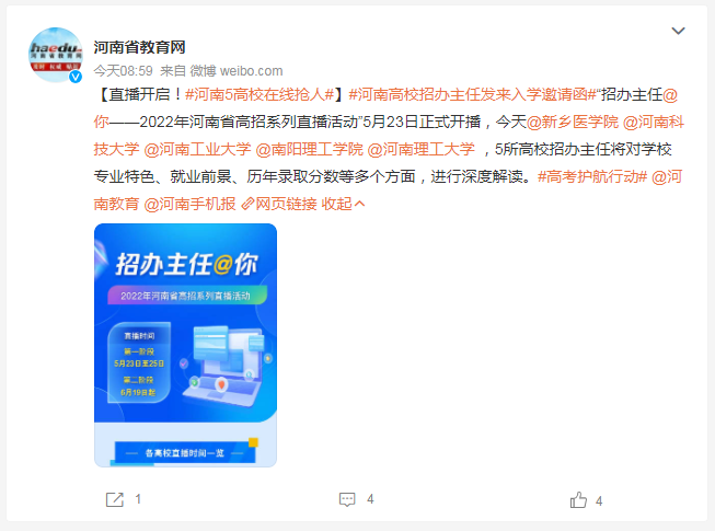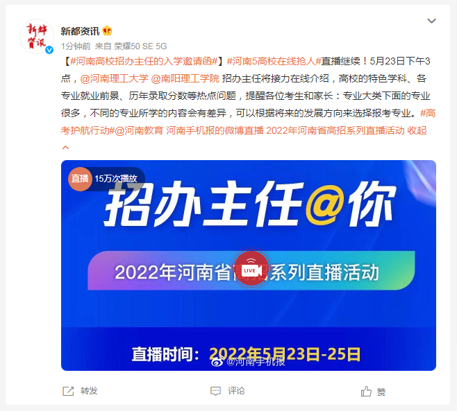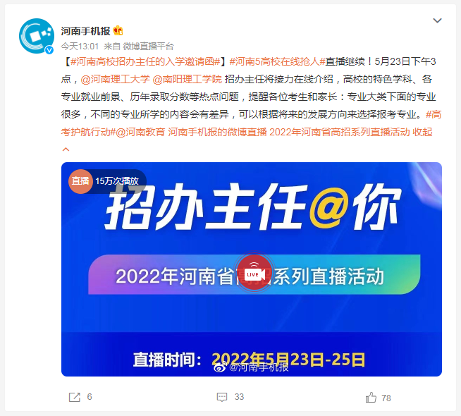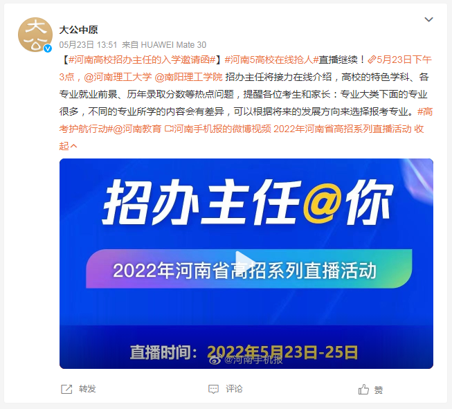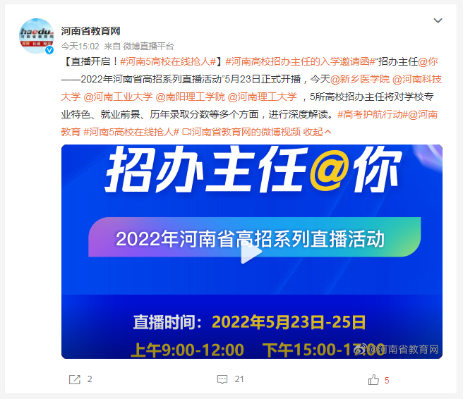 【直播开启!#河南5高校在线抢人#】#河南高校招办主任的入学邀请函#“招办主任@你——2022年河南省高招系列直播活动”5月23日正式开播,今天@新乡医学院 @河南科技大学 @河南工业大学 @南阳理工学院 @河南理工大学 ,5所高校招办主任将对学校专业特色、就业前景、历年录取分数等多个方面,进行深度解读。#高考护航行动#@河南教育 #河南5高校在线抢人# L河南省教育网的微博视频