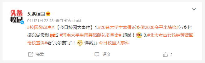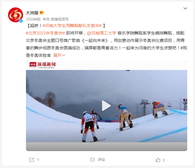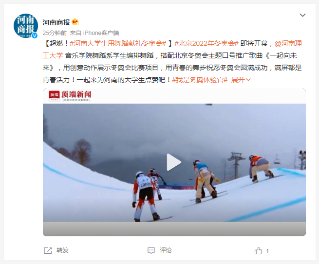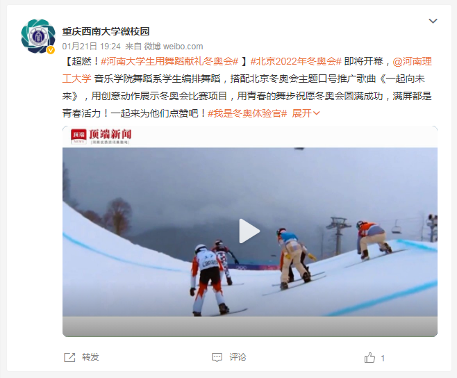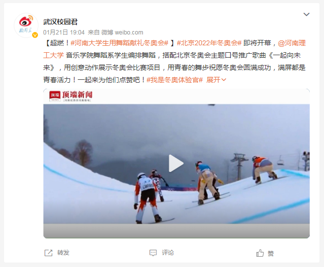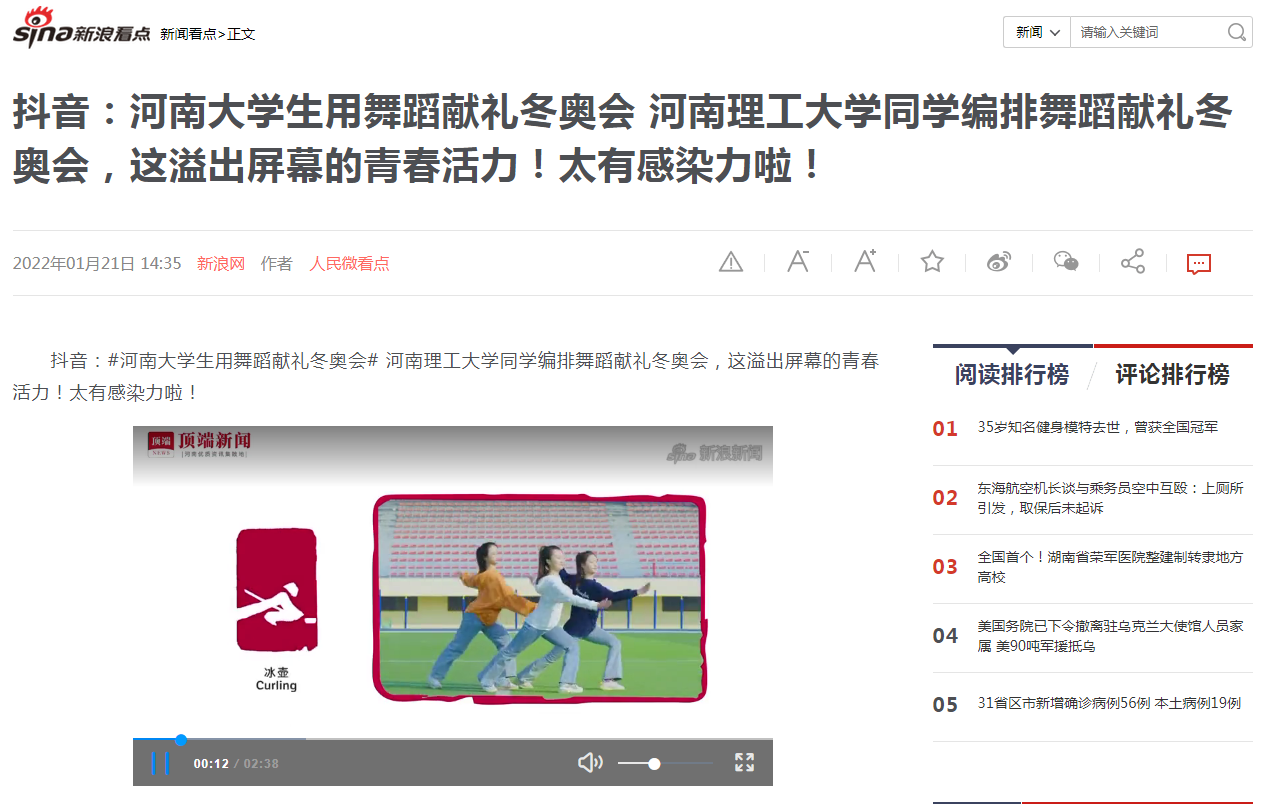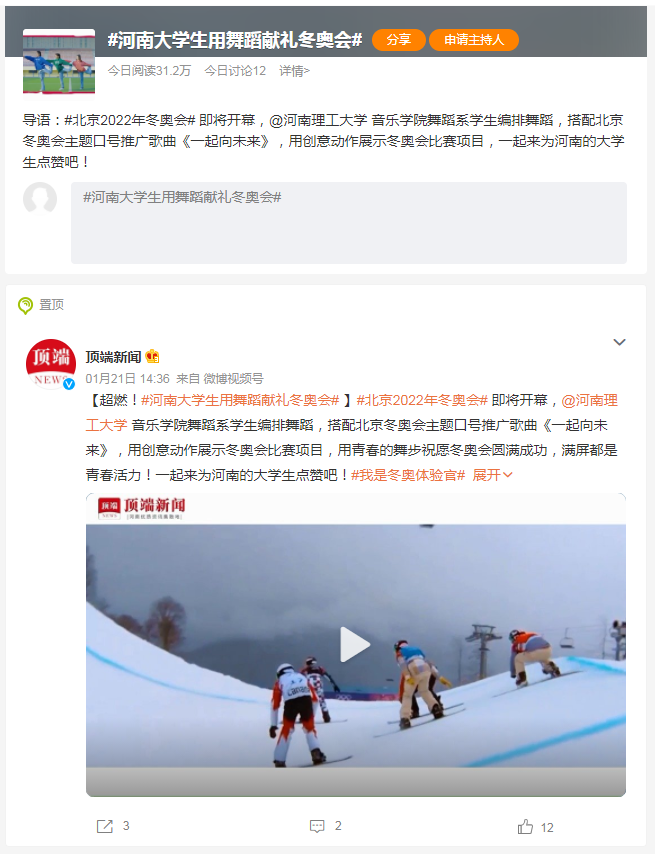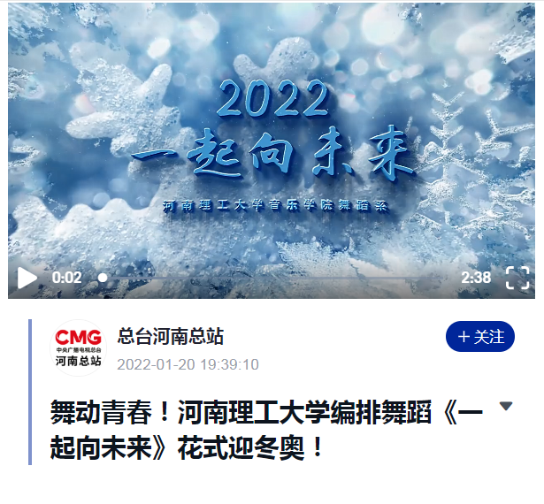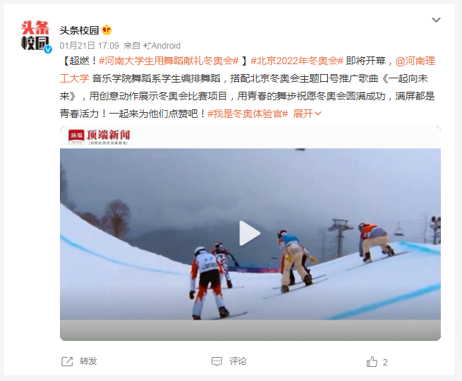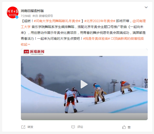该视频一经推出便引起社会主流媒体关注和广泛报道,央视新闻客户端、顶端新闻、河南日报农村版、大河报、河南商报、河南手机报、河南法制报、新浪网、新浪看点、头条校园等媒体纷纷报道或转发转载,微博话题#河南大学生用舞蹈献礼冬奥会#阅读量120万,树立了学校良好形象。
