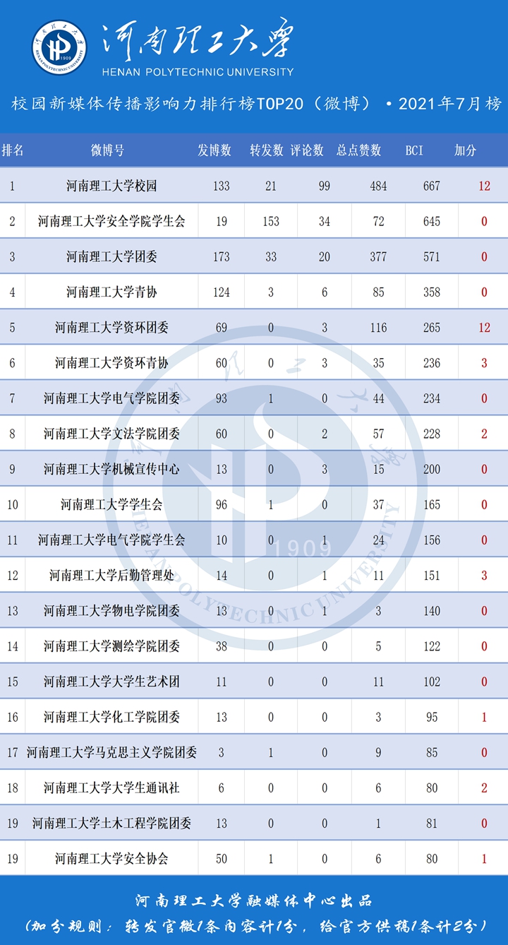 本网讯(通讯员 叶玲 曹子涵)7月,河南理工大学官方微博在全省高校排名第3位;官方微信在全省高校排名第4位,全国高校排名第64位。校内各新媒体平台围绕“高考录取”“暑假安排”“安全教育”等热点话题及时发布相关信息,与粉丝的互动性也明显提高,总体发展趋势良好。