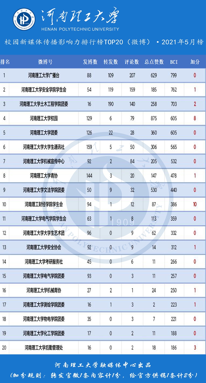 河南理工大学校内微博传播力指数排行榜(前20名)