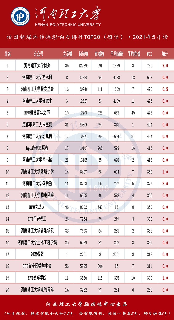 本网讯(通讯员 詹倩宇 王琳)5月,河南理工大学官方微博在全省高校排名第7位,全国高校排名第18位;官方微信在全省高校排名第3位。校内各新媒体平台围绕“庆贺党的100周年”“毕业季”“春季招聘会”等热点话题及时发布相关信息,吸引广大学生关注,总体发展趋势良好。