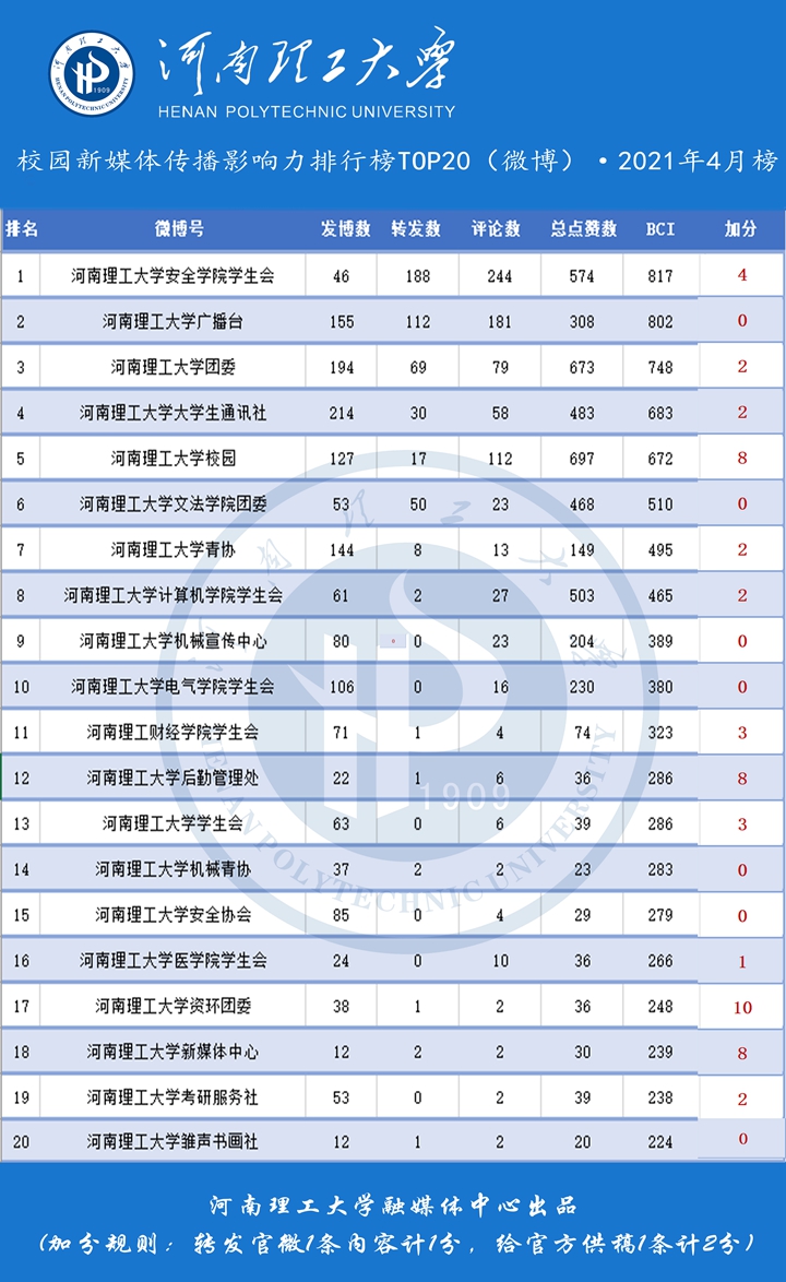 河南理工大学校内微博传播力指数排行榜(前20名)