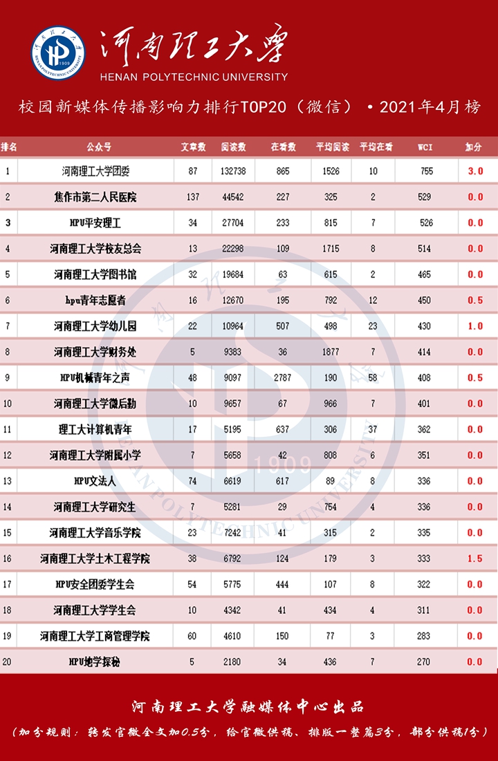 河南理工大学校内微信公众号传播力指数排行榜(前20名)