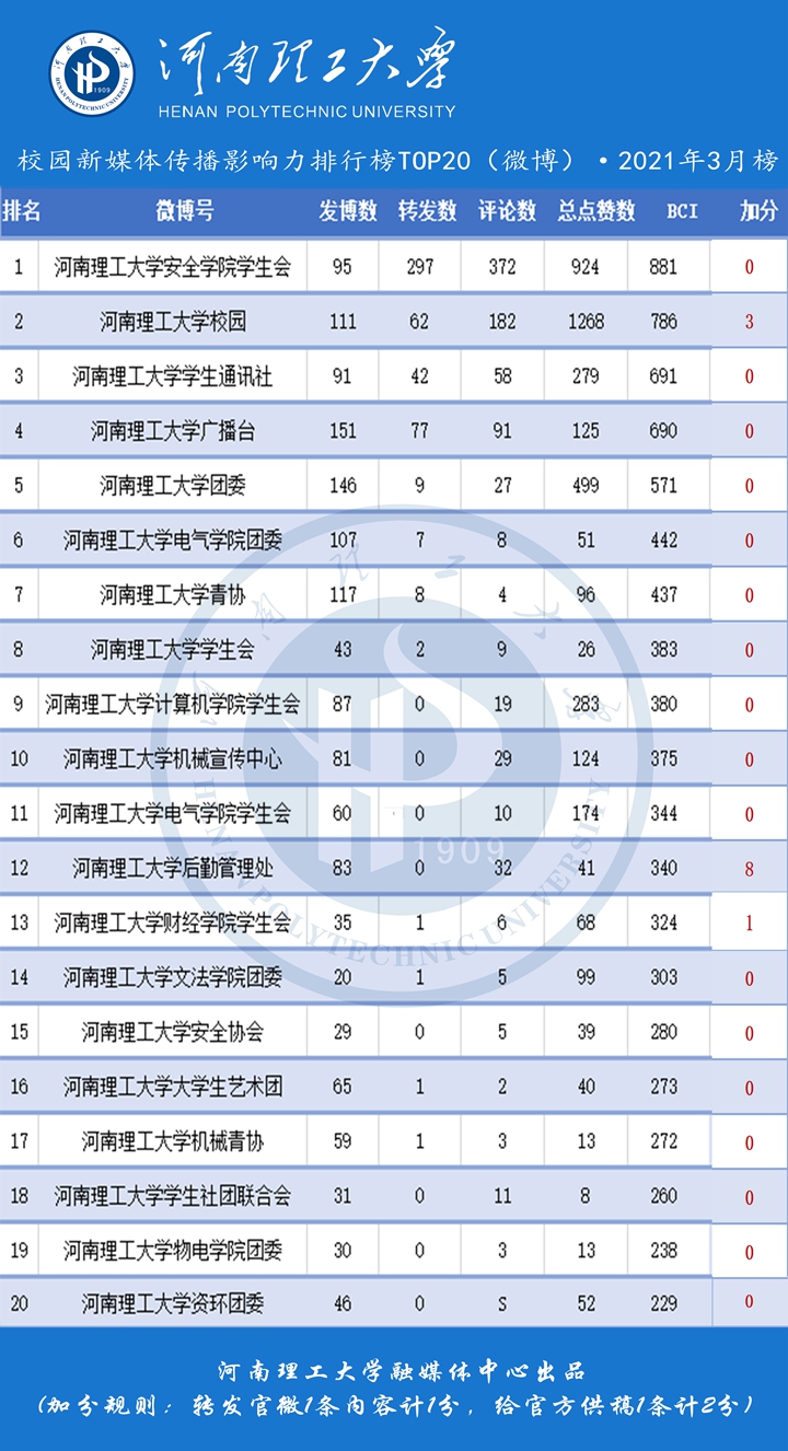 本网讯(通讯员 杨帅帅 庞雅萱)3月,河南理工大学官方微博在全省高校排名第5位,全国高校排名第37位,官方微信在全省高校排名第4位,全国高校排名第57位。本月正值开学季,话题度较高,校内各新媒体平台围绕“网课学习”“迎接建党100周年”“啦啦操进行时”等热点话题及时发布相关信息,展开讨论,总体发展趋势良好。