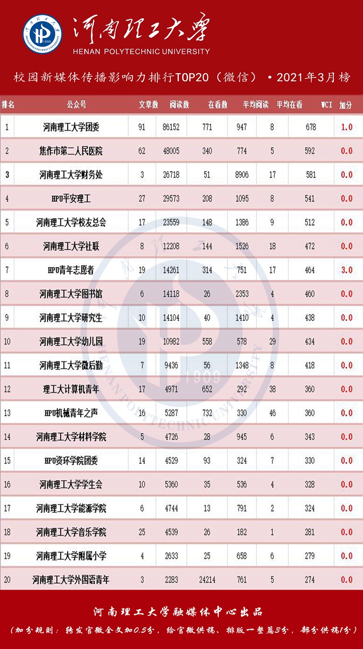 河南理工大学校内微信公众号传播力指数排行榜(前20名)