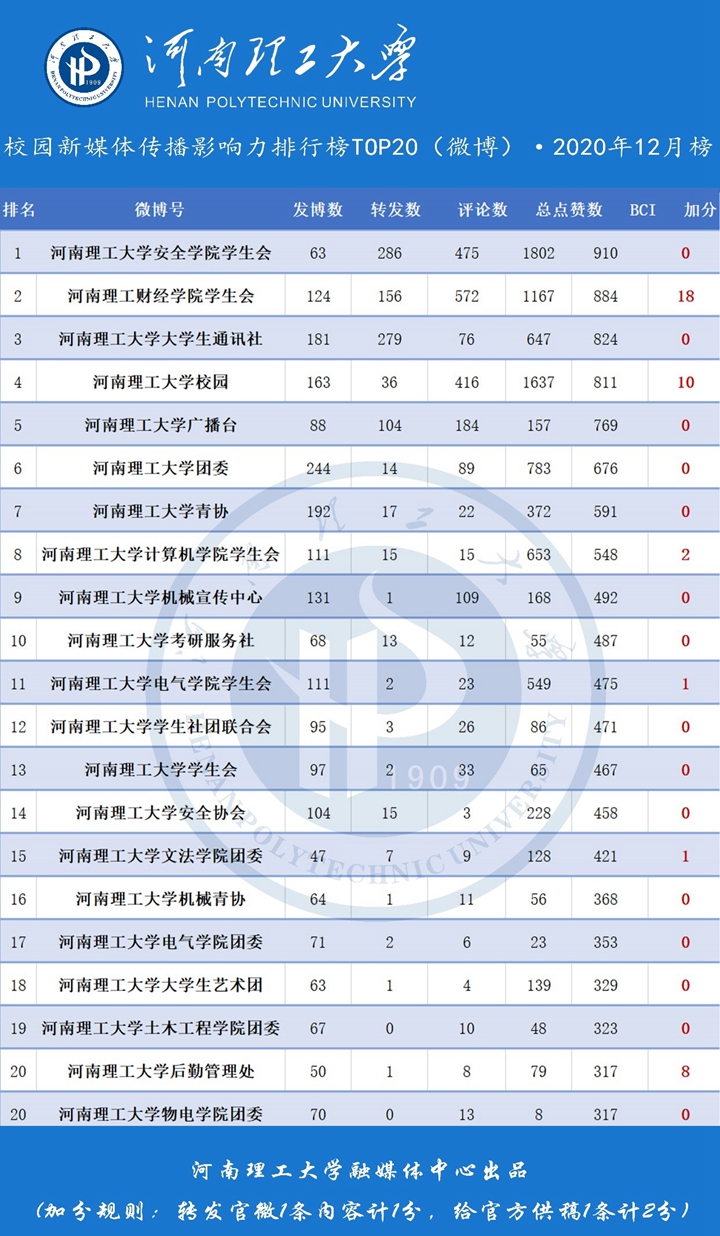 本网讯(通讯员 冯向红 薛浩宇)12月,河南理工大学官方微博在全省高校排名第4位,全国第17位;官方微信在全省高校排名第5位,全国第70位。