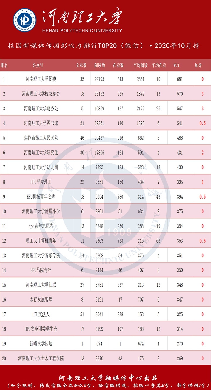 河南理工大学校内微信公众号传播力指数排行榜(前20名)