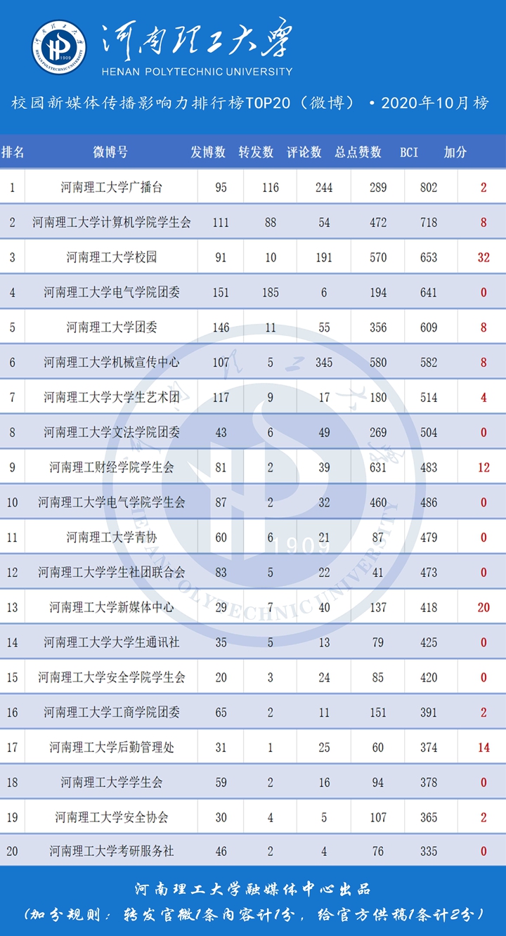 河南理工大学校内微博传播力指数排行榜(前20名)