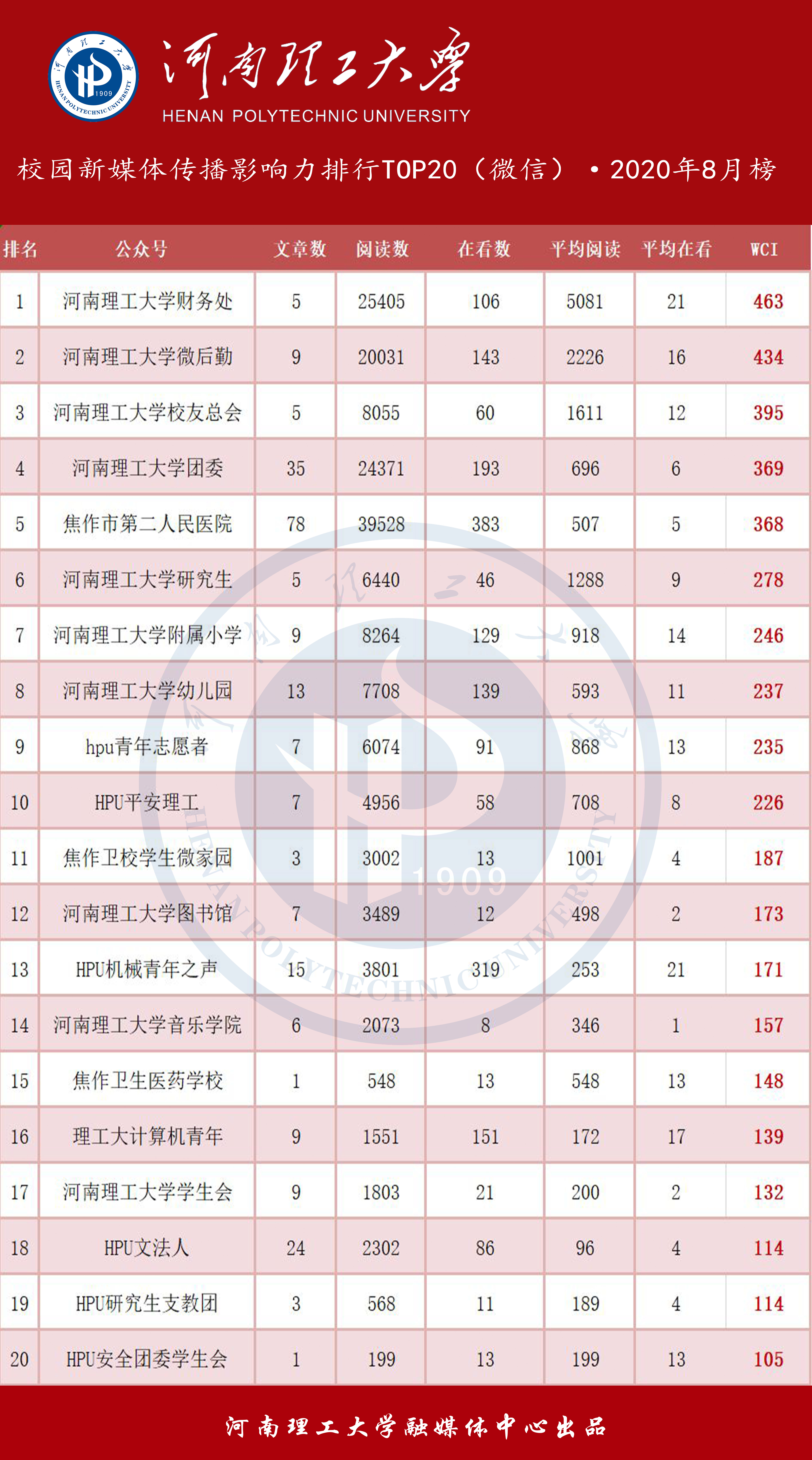 本月校内微信公众号平台活跃较上月有较大提升,河南理工大学财务处以仅5篇优质推文,获WCI(微信传播指数)558,位居榜单第一。河南理工大学微后勤以学子们开学所关心的后勤事务为核心,发布9篇贴合学子们关心的后勤事务的文章, WCI 496,位居榜单第二位。