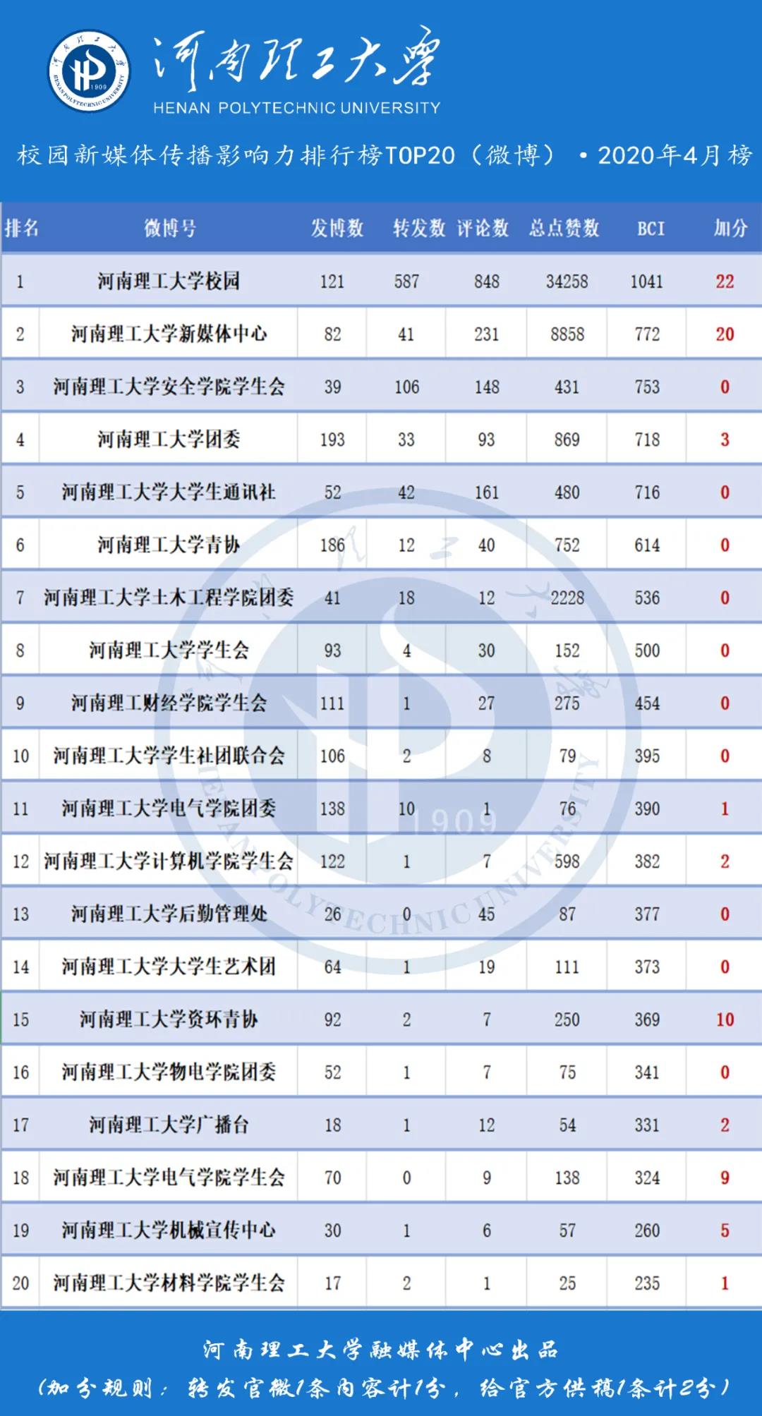 河南理工大学校内微博传播力指数排行榜(前20名)