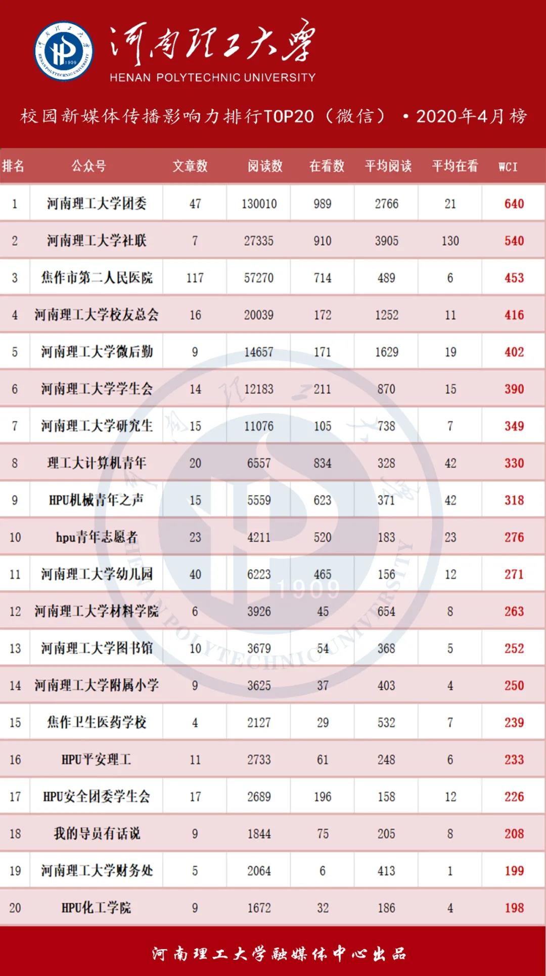 河南理工大学校内微信公众号传播力指数排行榜(前20名)