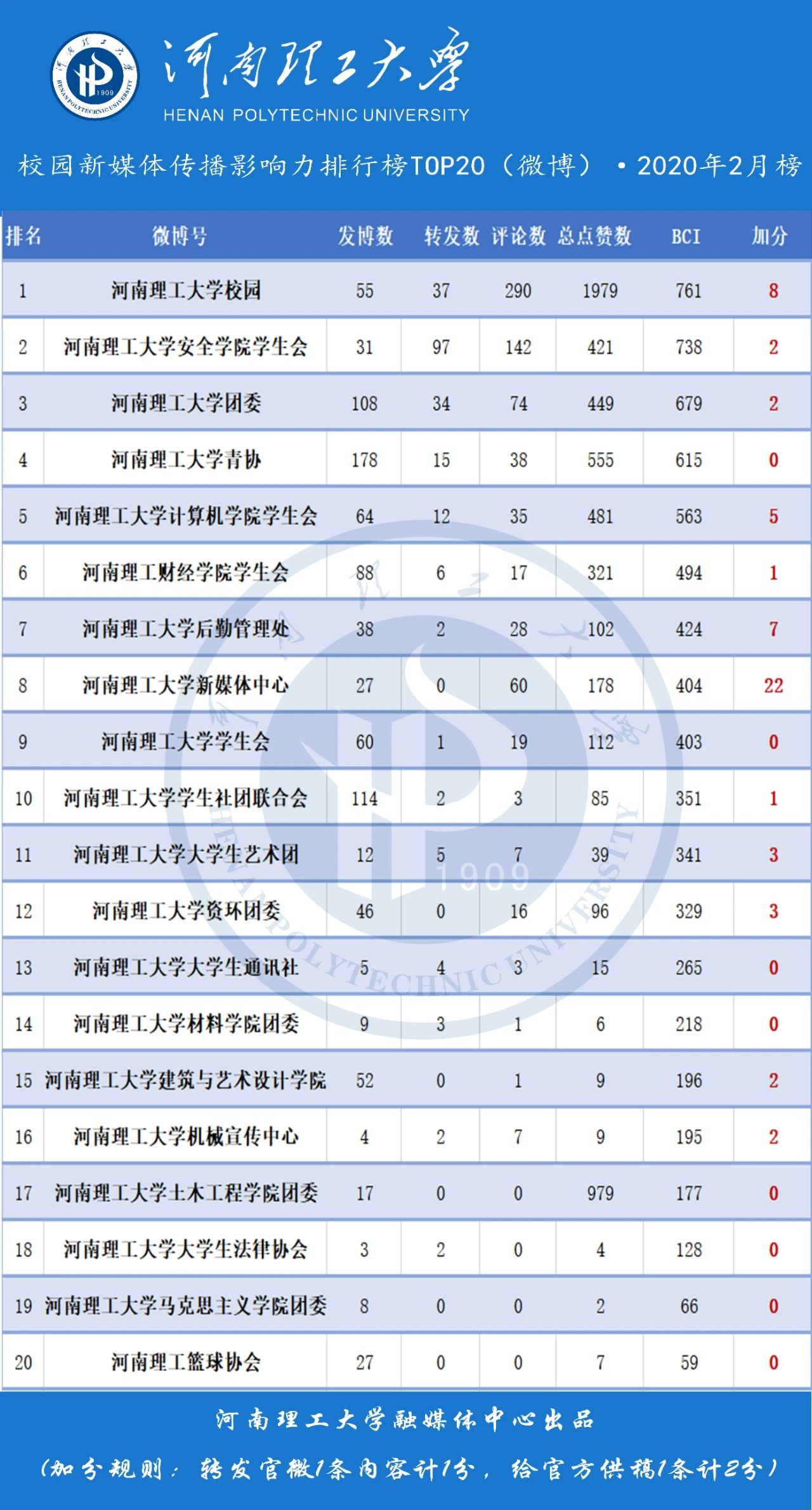 二月,河南理工大学官方微博在全省高校排名第5位,全国第30位;官方微信在全省高校排名第3位,全国第77位。