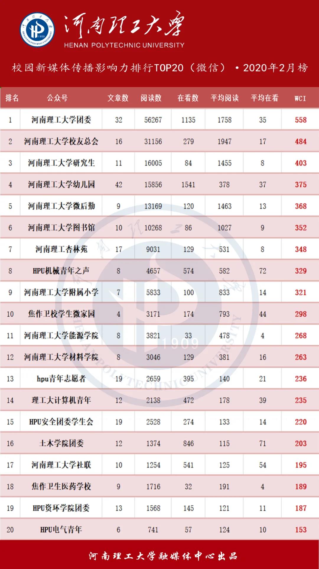 河南理工大学校内微信公众号传播力指数排行榜(前20名)