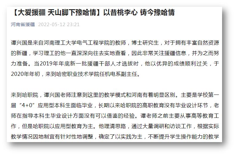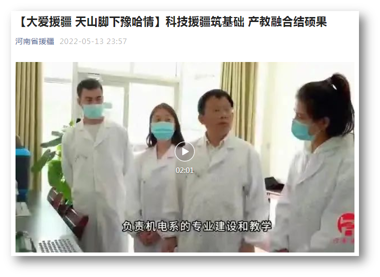 日前,河南省援疆官方微信平台分别以《科技援疆筑基础 产教融合结硕果》《以昔桃李心 铸今豫哈情》为题,报道了我校第十批援疆教师机械学院盛伟、电气学院谭兴国的先进事迹。