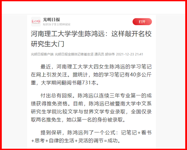 本网讯(记者 胡华伟)连日来,我校大四女生陈鸿远的学习笔记在网上引发持续关注。目前,陈鸿远已被暨南大学中文系研究生学院比较文学与世界文学专业录取。光明日报客户端、中国青年报客户端、人民网河南频道、大河报、大河网、大公网等媒体对此事进行了报道。此外,该事件在新浪微博阅读量已超千万。相关内容如下: