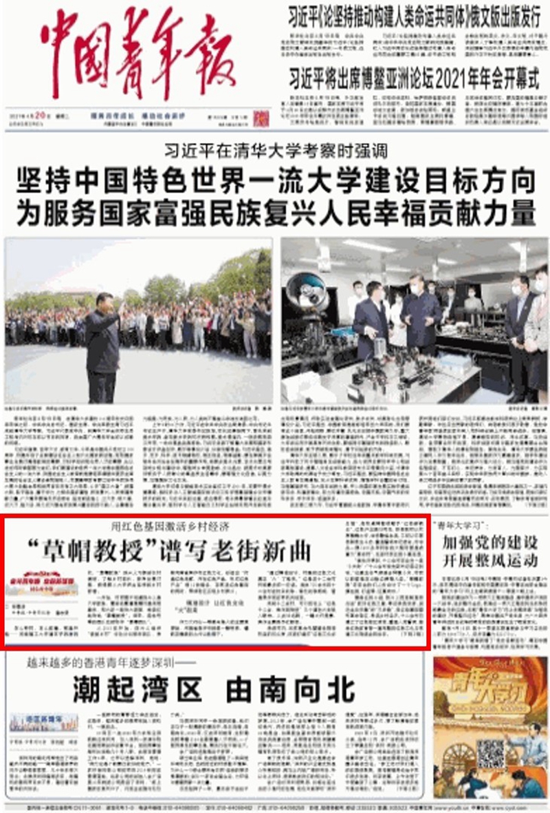 本网讯(记者 徐春浩)《中国青年报》2021年4月20日头版(第1版)以《用红色基因激活乡村经济 “草帽教授”谱写老街新曲》为题,报道我校建艺学院原院长、“草帽教授”陈兴义,积极组织“美丽乡村”行动计划服务团队,精准设计让红色文化“火”起来、做大“红色+”让革命文物“活”起来、打造红色文旅让旅游品牌“亮”起来,在激活红色基因的同时,带领老区实现乡村振兴。新华网、人民网、光明网、中国青年网等予以转载。相关内容如下:
