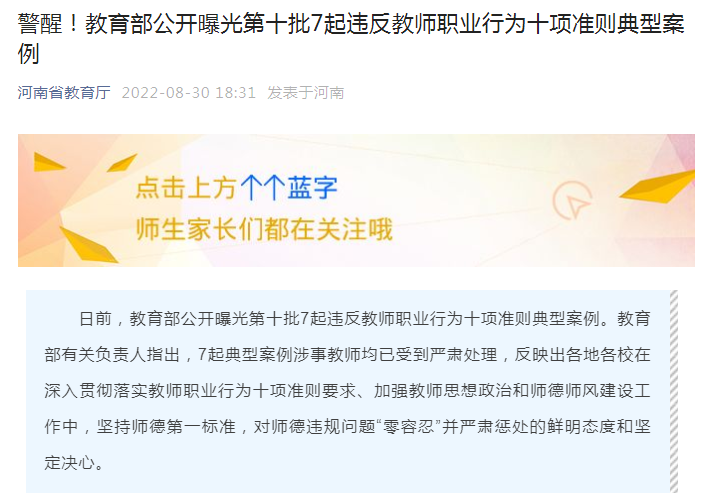 日前,教育部公开曝光第十批7起违反教师职业行为十项准则典型案例。教育部有关负责人指出,7起典型案例涉事教师均已受到严肃处理,反映出各地各校在深入贯彻落实教师职业行为十项准则要求、加强教师思想政治和师德师风建设工作中,坚持师德第一标准,对师德违规问题“零容忍”并严肃惩处的鲜明态度和坚定决心。