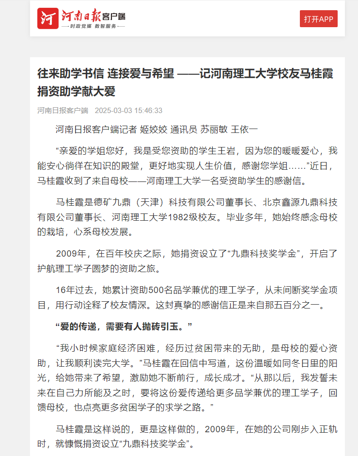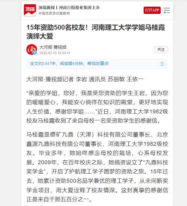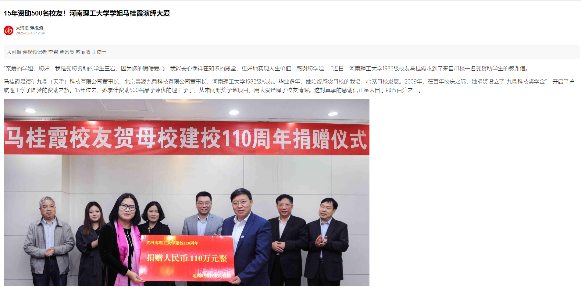 马桂霞是德矿九鼎(天津)科技有限公司董事长、北京鑫源九鼎科技有限公司董事长、河南理工大学1982级校友。毕业多年,她始终感念母校的栽培,心系母校发展。2009年,在母校百年校庆之际,她捐资设立了“九鼎科技奖学金”,开启了护航理工学子圆梦的资助之旅。15年过去,她累计资助500名品学兼优的母校学子。
