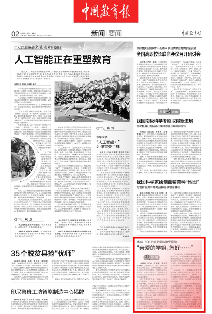 3月1日,《中国教育报》第二版要闻,以《15年,500名学弟学妹接受资助 “亲爱的学姐,您好……”》为题,宣传报道学校1982级校友马桂霞捐资助学,用大爱温暖母校学子的典型事迹。具体内容如下: