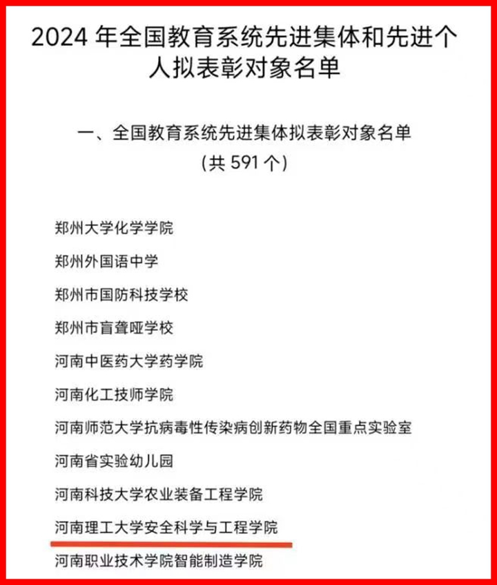 8月,在人力资源社会保障部和教育部联合开展的全国教育系统先进集体和先进个人评选表彰中,学校安全科学与工程学院喜获“全国教育系统先进集体”称号,该评选每5年开展一次,是全国教育系统的最高集体荣誉。9月,安全科学与工程学院教师魏建平当选“2024年河南省最美教师”。