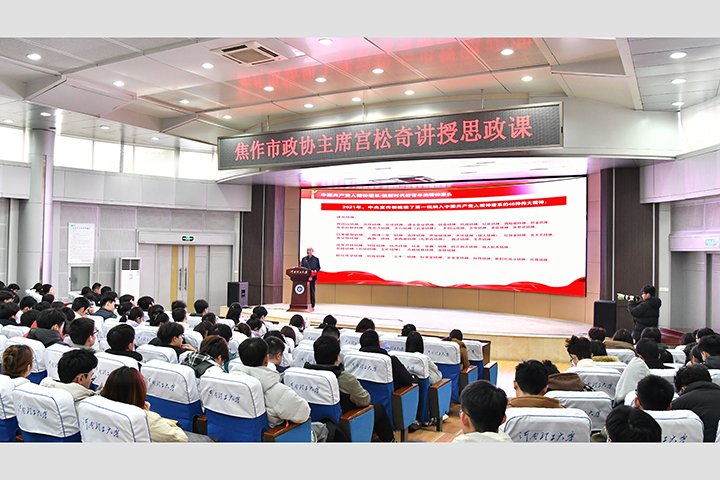 本网讯(记者 段志强/文 李为群 通讯员 韦东星/图)12月12日,焦作市政协党组书记、主席宫松奇在学校力行楼学术报告厅讲授题为《发扬伟大革命精神 做有理想、敢担当、能吃苦、肯奋斗的新时代好青年》的思政课。校党委副书记解伟主持,本科生、研究生、青马社及青马班学生代表230余人参加学习。