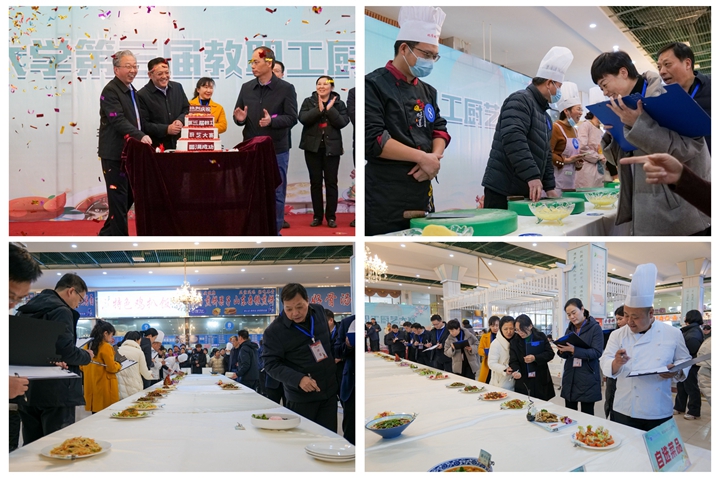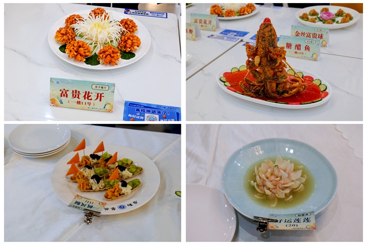 比赛开始,队员们换上厨师围裙,戴上厨师帽,瞬间化身为技艺精湛的大厨,各参赛队伍大展身手,煎、炒、烹、炸,十八般厨艺齐上阵,纷纷拿出自己的看家本领。从精美的雕花摆盘到创意十足的菜品搭配,每一个细节都展现出教职工们对美食独特的理解与热爱。剁椒鱼头、板栗烧子鸡、锦上添花、开卷有益、紫气东来……一盘盘色香味俱全的美味佳肴陆续出炉,色泽鲜艳,香气扑鼻,令人垂涎欲滴,引得在场观众阵阵赞叹。同时,本届厨艺大赛还设置了厨艺展示环节,餐厅厨师现场展示了花样甩面、果蔬卡通包制作,以及菊花豆腐和土豆丝的刀工展示,充分展现了后勤大厨们的精湛厨艺。活动间隙,礼仪操表演、歌舞《不忘初心》、笛子合奏《牧场欢歌》、歌伴舞《一路都是歌》等文艺节目也纷纷呈现,赢得在场师生的阵阵喝彩。活动设置的抽奖环节,更是将现场气氛推向高潮。同时,由各餐厅精心推出的创意特色菜品的展示,更是让评委和现场的观众赞不绝口。经过紧张激烈的角逐,评委们根据菜品的色、香、味、形以及创意等多个方面进行综合评分,最终,创新创业学院获得“刀工比赛一等奖”,物电学院、后勤保障部、离退休处获得二等奖,外国语学院、机关工会3队、应急学院、继续教育学院、利莫瑞克国际学院、数信学院获得三等奖。机关2队获得“炒菜比赛一等奖”,医学院、创新创业学院、资源环境学院获得二等奖,资产公司、物电学院、机关1队、后勤保障部、软件学院、机关3队获得三等奖。创新创业学院获得“团体一等奖”,机关2队、后勤保障部、物电学院获得二等奖,应急学院、医学院、机关1队、资产公司、机关3队、工商学院获得三等奖。