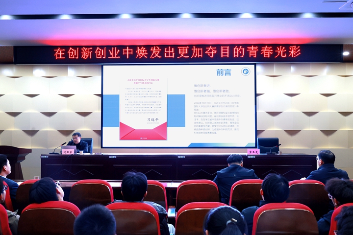 边亚东围绕“国家和地方有关创新创业的顶层设计和政策解读”“我校创新创业教育改革的平台、制度、服务体系构建”“做好学科竞赛工作,增强双创实践能力”“对大学生创新创业的几点希望和要求”4个方面进行了生动详实的讲解。他强调,当今时代是“创新求生存、创业求发展”的时代,大学生创新创业是助推国家创新驱动发展战略的时代要求,是促进社会经济高质量发展的重要动力,是实现青年大学生成长成才的重要引擎。他指出,广大师生要站位全局,深刻认识创新创业的重要意义;勇担使命,准确把握创新创业的时代机遇;砥砺前行,在创新创业中实现人生价值。