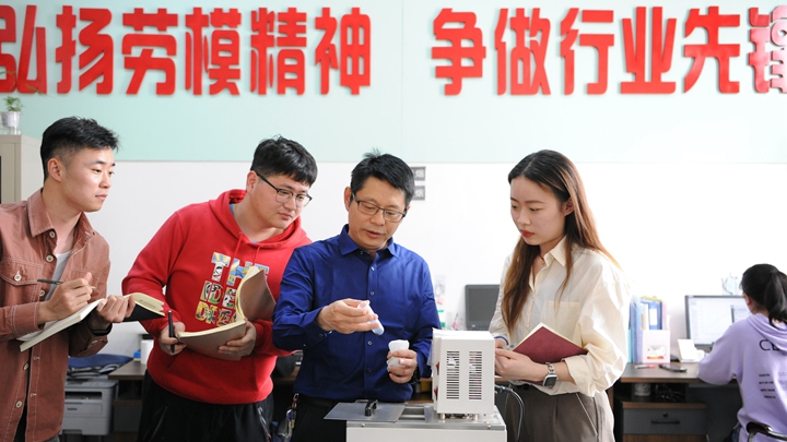 在“河南省总工会魏建平劳模创新工作室”里,“全国高校黄大年式教师团队”带头人、魏建平教授(右二) 为学生们讲解煤层注水添加剂的选配以及润湿效果。