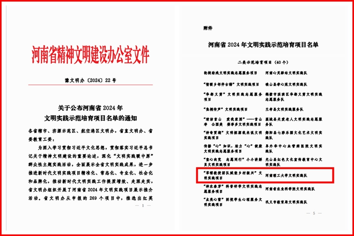 本网讯(记者 马志敏)近日,河南省文明办印发《关于公布河南省2024年文明实践示范培育项目名单的通知》,公布全省2024年文明实践示范培育项目推选结果。党委宣传部(校文明办)推荐的“草帽教授团队赋能乡村振兴”文明实践项目成功获评全省二类示范培育项目,这是学校在该推选中获得的最好成绩,实现了文明实践创建活动的历史性突破。