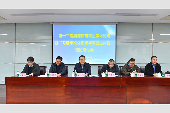 本网讯(通讯员 刘一兵 梁宁/文 记者 李为群/图)11月23日,我校马克思主义学院、河南省中国特色社会主义理论体系研究中心(河南理工大学基地)在明德楼一楼会议室举办第十二届崇德杯研究生学术论坛暨“习近平文化思想与巩固文化主体性”理论研讨会。副校长程伟出席研讨会并致辞。中国矿业大学马克思主义学院副院长曹洪军、首都师范大学马克思主义学院韩文乾应邀参加会议并作主旨报告。马克思主义学院党政领导洪振涛、陈留根、王新刚,以及该院教师代表、论坛获奖学生代表参加会议。马克思主义学院2023级、2024级全体研究生参与交流学习。研讨会采取线上线下相结合的方式进行。