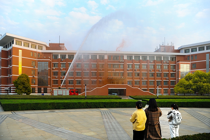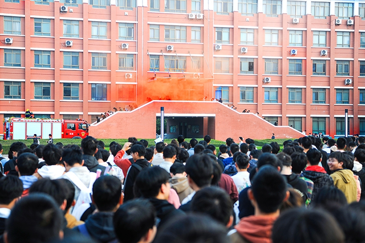 同学们在工作人员的指导下,分别在一号教学楼、一号实验楼、第一图书馆前进行灭火救援实战演练。