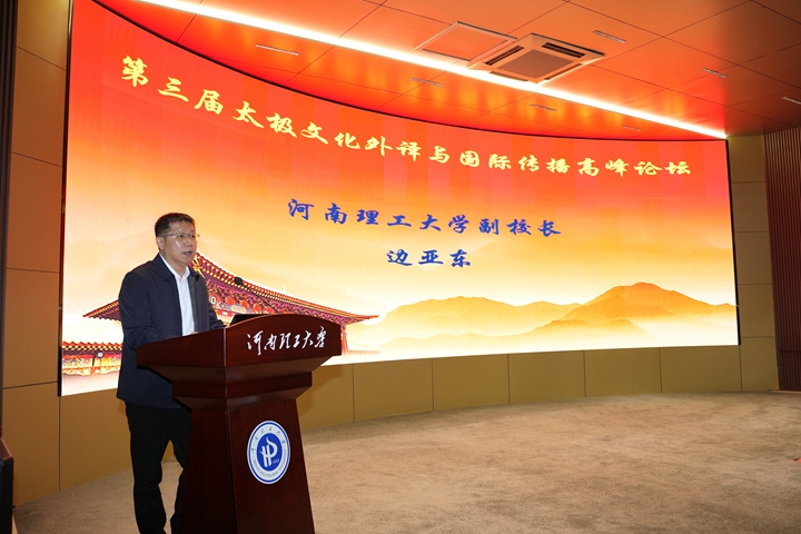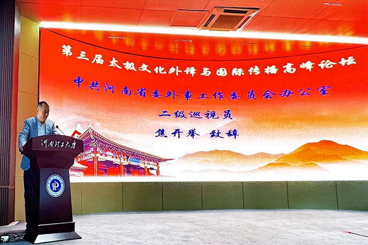 本网讯(通讯员 许亚男)10月19日,由中国外文局中国翻译研究院、中共河南省委外事工作委员会、河南省高等教育学会外语教学研究分会和学校主办的“第三届太极文化外译与国际传播高峰论坛”在力行楼学术报告厅顺利举行。当代中国与世界研究院副院长范大祺、省委外办二级巡视员焦开举、副校长边亚东,以及校职能部门和部分兄弟学院领导、教师、学生参加会议。论坛由外语学院院长李惠敏主持。