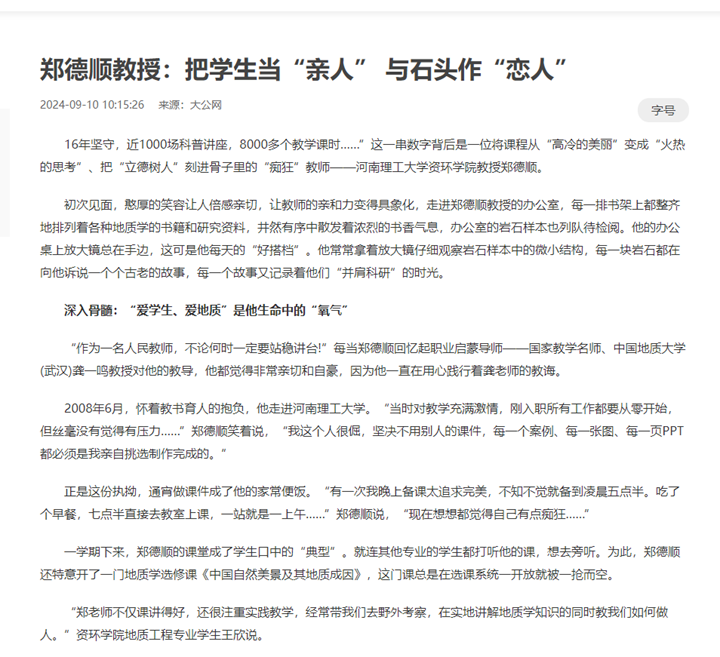 对课程思政的认识和实践,郑德顺能称得上是河南高校中的先行者。早在2016年,他就开始积极探索,有意识地将科学家精神、人文素养等课程思政元素融入《地质学基础》,后来该门课程获批首批河南省高等学校课程思政样板课程、河南省精品在线开放课程、河南省一流课程等。