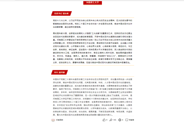 中国共产党第二十届中央委员会第三次全体会议在北京胜利召开,会议重点研究进一步全面深化改革、推进中国式现代化问题,尤其是对教育、科技、人才是中国式现代化的基础性、战略性支撑的重要论述,成为指引教育综合改革的根本遵循,为高等教育深化改革提出了新要求、指明了新方向。河南理工大学作为河南省“双一流”创建工程高校和省特色骨干大学建设高校,多年来,始终坚持党的教育方针和社会主义办学方向,为国家能源工业安全发展和区域经济社会发展作出了重要贡献,在一流大学建设快速道上跑出了加速度。2024年,是河南理工大学召开第三次党代会、庆祝建校115周年的关键之年,站在新的历史起点,学校将深入学习贯彻党的二十届三中全会精神,全面贯彻党的教育方针,落实立德树人根本任务,牢牢扭住“优化学科专业布局、强化师资队伍建设、深化综合改革”三个关键点,以服务国家经济社会建设和区域协调发展为目标,以学科建设为龙头,以教育质量提升为核心,以改革创新为驱动,深化改革、优化结构、提高质量,不断实现创新发展、特色发展、内涵发展,着力为中国式现代化发展培养更多堪当民族复兴重任的时代新人。