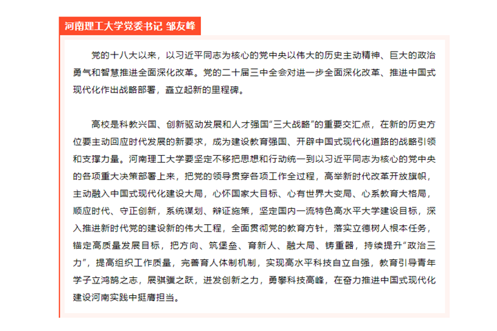 河南理工大学党委书记邹友峰表示,党的十八大以来,以习近平同志为核心的党中央以伟大的历史主动精神、巨大的政治勇气和智慧推进全面深化改革。党的二十届三中全会对进一步全面深化改革、推进中国式现代化作出战略部署,矗立起新的里程碑。高校是科教兴国、创新驱动发展和人才强国“三大战略”的重要交汇点,在新的历史方位要主动回应时代发展的新要求,成为建设教育强国、开辟中国式现代化道路的战略引领和支撑力量。河南理工大学将继续坚定不移把思想和行动统一到以习近平同志为核心的党中央的各项重大决策部署上来,把党的领导贯穿各项工作全过程,高举新时代改革开放旗帜,主动融入中国式现代化建设大局,心怀国家大目标、心有世界大变局、心系教育大格局,顺应时代、守正创新,系统谋划、辩证施策,坚定国内一流特色高水平大学建设目标,深入推进新时代党的建设新的伟大工程,落实立德树人根本任务,锚定高质量发展目标,把方向、筑堡垒、育新人、融大局、铸重器,持续提升“政治三力”,提高组织工作质量,完善育人体制机制,实现高水平科技自立自强,教育引导青年学子立鸿鹄之志,展骐骥之跃,迸发创新之力,勇攀科技高峰,在奋力推进中国式现代化建设河南实践中挺膺担当。