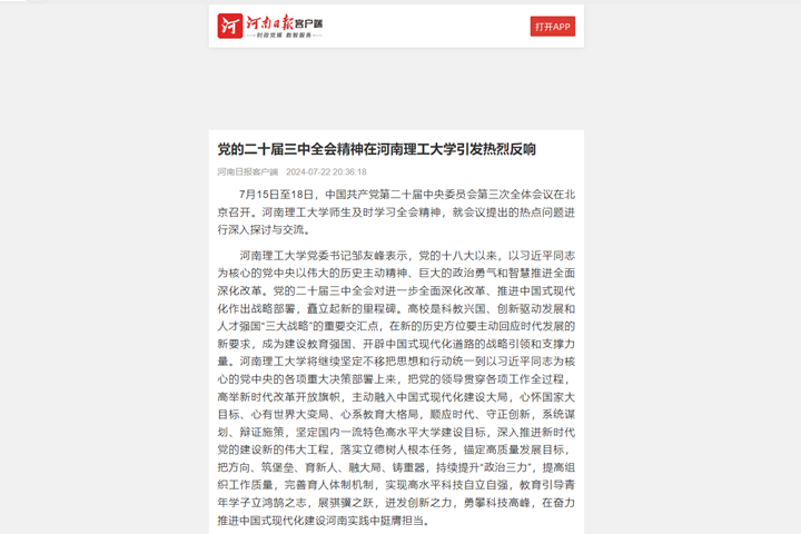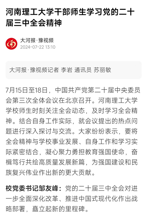 7月15日至18日,中国共产党第二十届中央委员会第三次全体会议在北京召开。河南理工大学师生及时学习全会精神,就会议提出的热点问题进行深入探讨与交流。