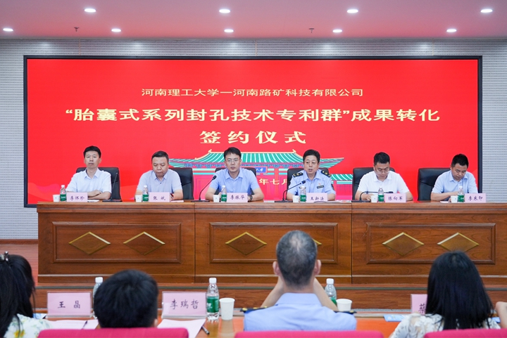 本网讯(通讯员 楚克明)7月18日,“胎囊式系列封孔技术专利群”科技成果转化签约仪式在我校重点实验室大楼举行。焦作市市场监管局党组成员王新法、高新区知识产权促进科科长郭永新、河南路矿科技有限公司总经理张斌等参加签约仪式,副校长李振华出席并讲话。仪式由能源学院党委书记李怀珍主持。