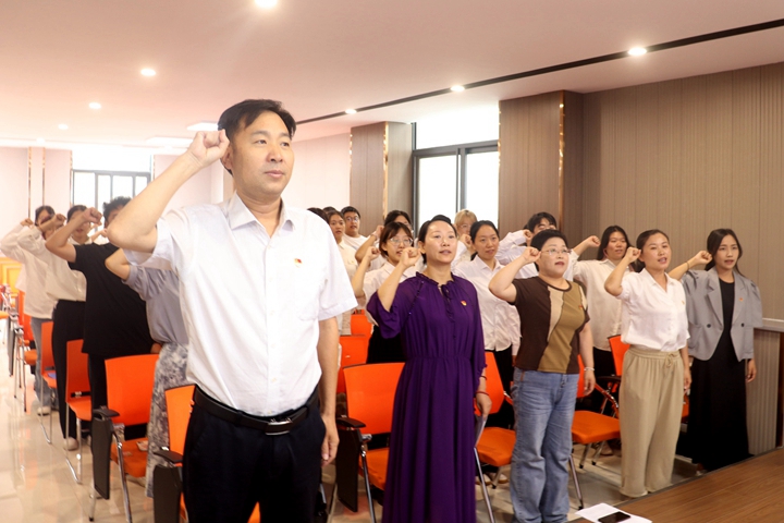 院党委书记王景琳对全体党员致以诚挚问候,并从三个方面对全体党员提出了殷切期望:一要坚定理想信念,牢记初心使命;二要加强党纪学习,提升党性修养;三要强化责任担当,增强行动自觉。她强调全体党员不仅要从组织上入党,更要从思想上、行动上入党。要认真履行党员义务,努力践行入党誓词,争当表率,为“共产党员”这个光荣的称号增光添彩。最后,会议以奏唱《国歌》圆满结束。会后,全体党员共同观看了《党课开讲啦|入党誓词的演变》,进一步加深了对入党誓词的理解。