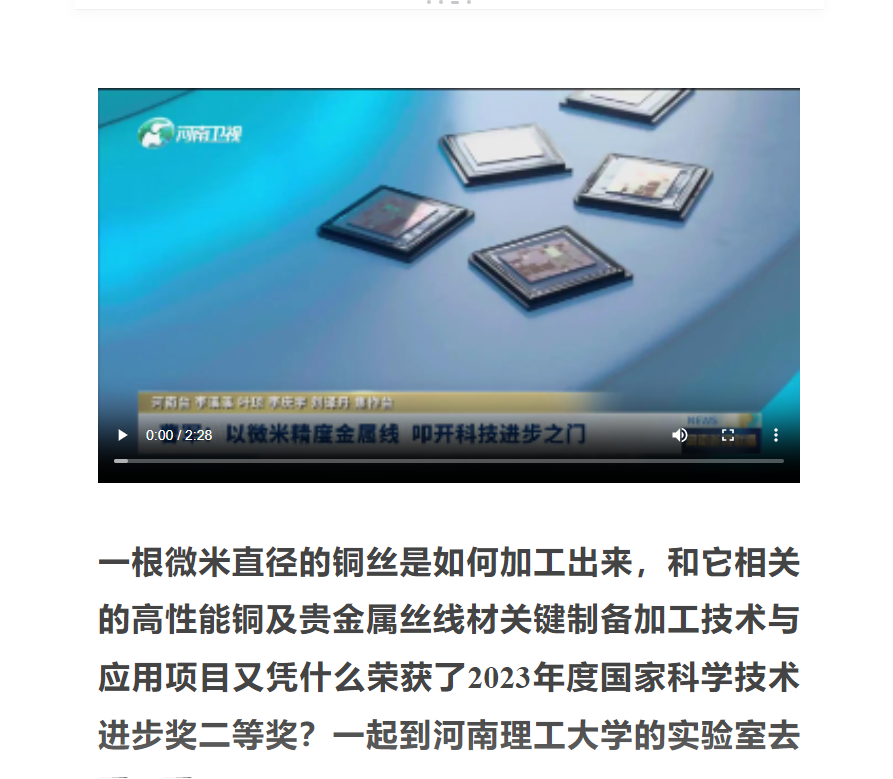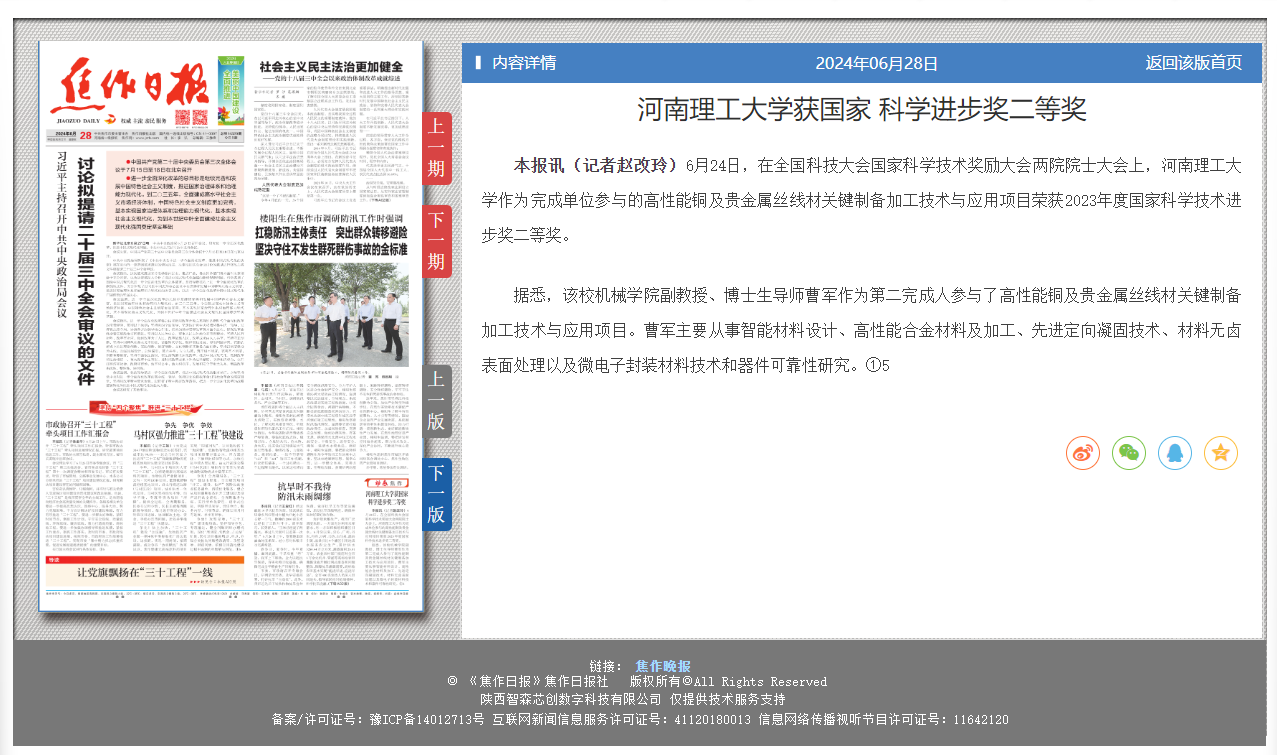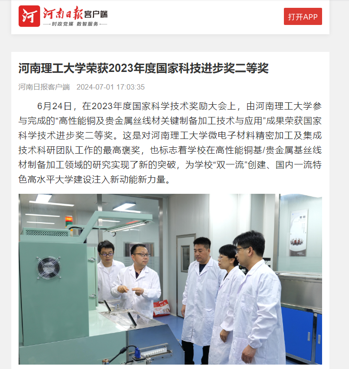 日前,在2023年度国家科学技术奖励大会上,由河南理工大学参与完成的“高性能铜及贵金属丝线材关键制备加工技术与应用”成果荣获国家科学技术进步奖二等奖。连日来,中国科学报、河南日报等媒体进行了报道。相关内容如下:
